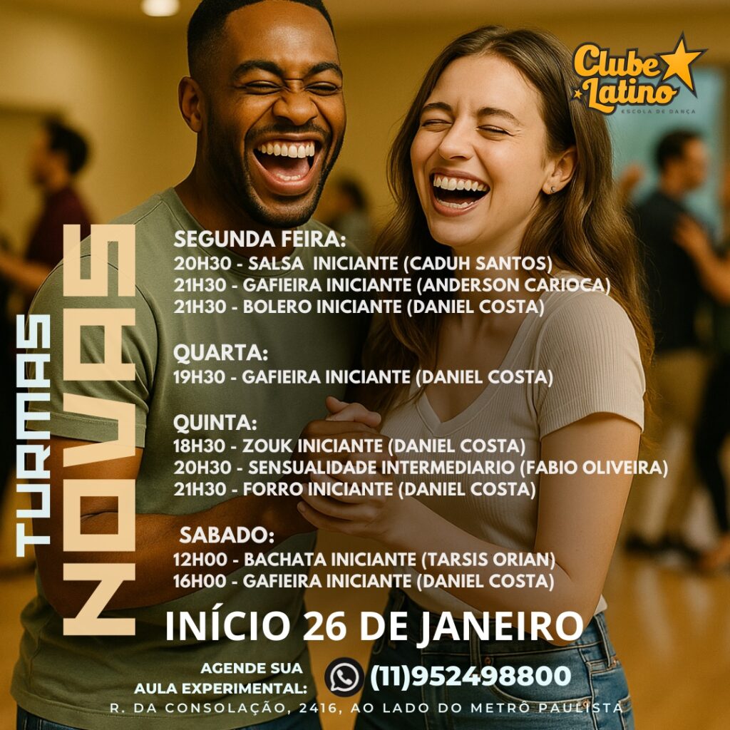 Eu conheci o Clube Latino em maio de 2022 e desde a primeira aula eu me encantei pelo lugar. Comecei fazendo apenas 1 aula, mas com o tempo você vai sempre querendo aprender outros ritmos. Atualmente faço aula com a Natasha, Daniel, Katlyn e Caique, que são professores incríveis, super pacientes e didáticos. O Clube também oferece cursos de férias e workshops semanas de ritmos e níveis diversos, sempre com ótimos professores. E o atendimento impecável não é apenas dos professores, mas também da recepção pela Sthefanie e pelo Choy, que sempre são muito prestativos. Recomendo muito que conheçam o Clube Latino! ?